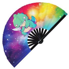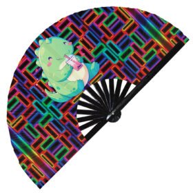 Cute T-rex Drinking Boba Rainbow Dinosaur – Clack Folding Rave & Festival Hand Fan