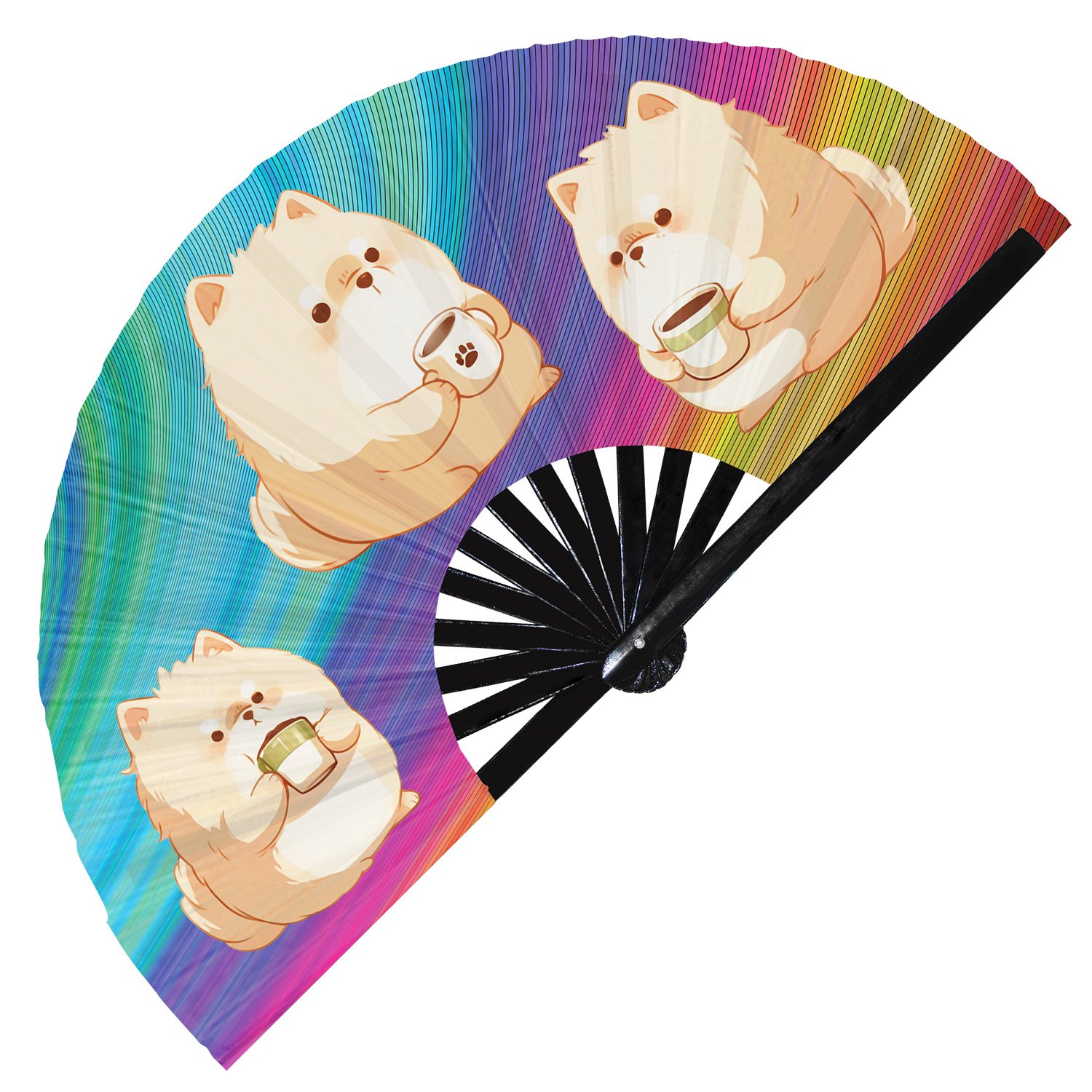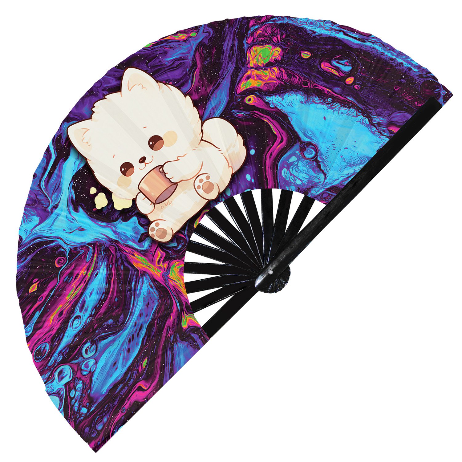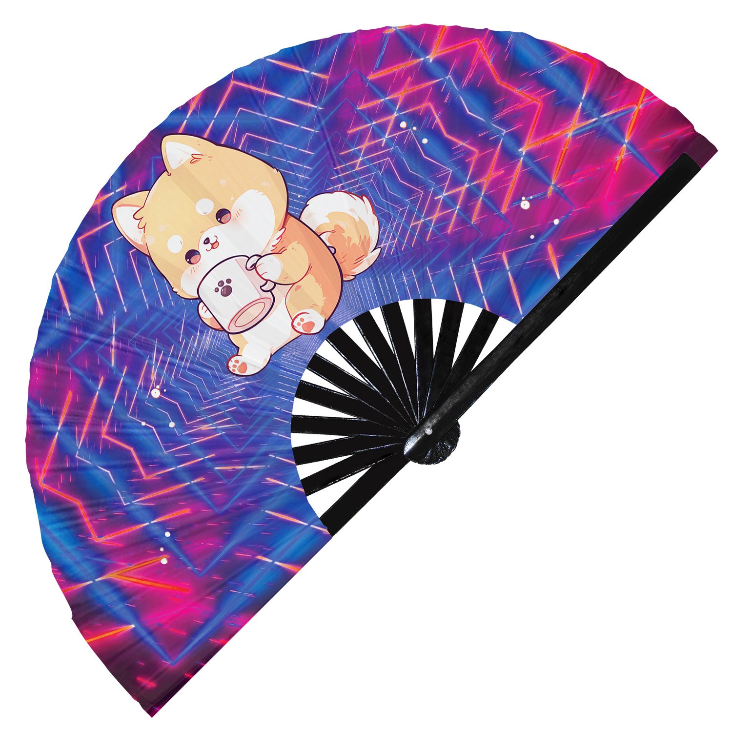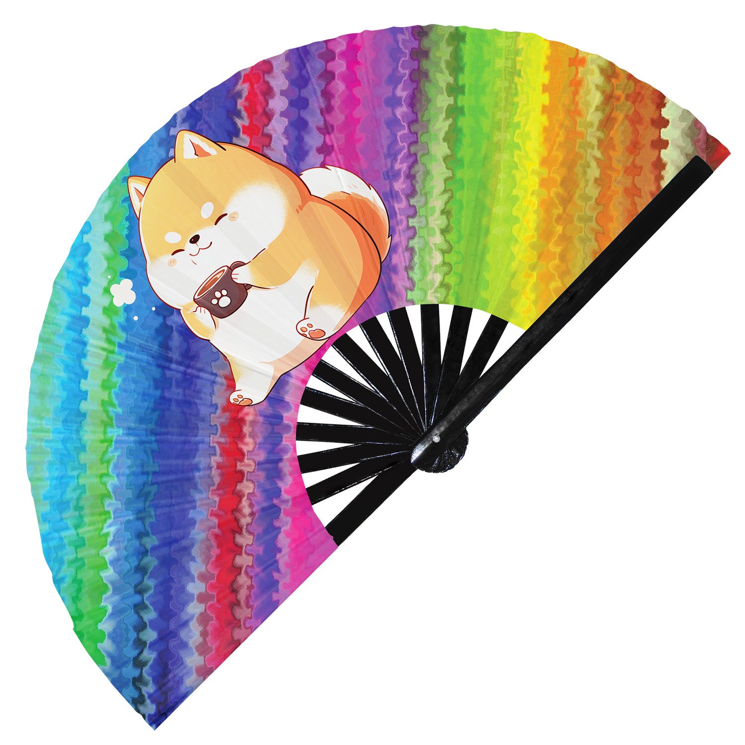 Cute Dog Drinking Coffee Rainbow Puppy – Clack Folding Rave & Festival Hand Fan