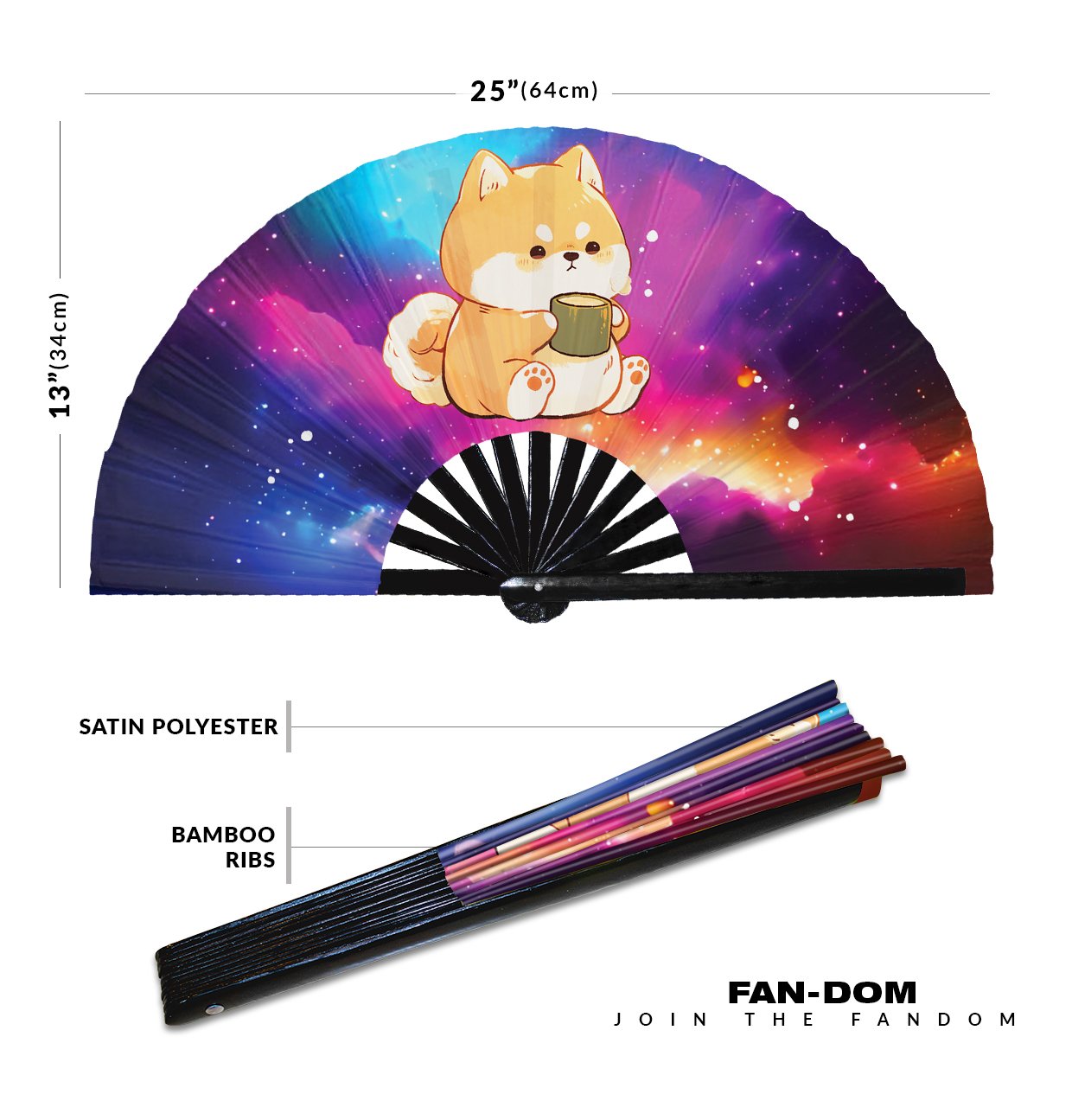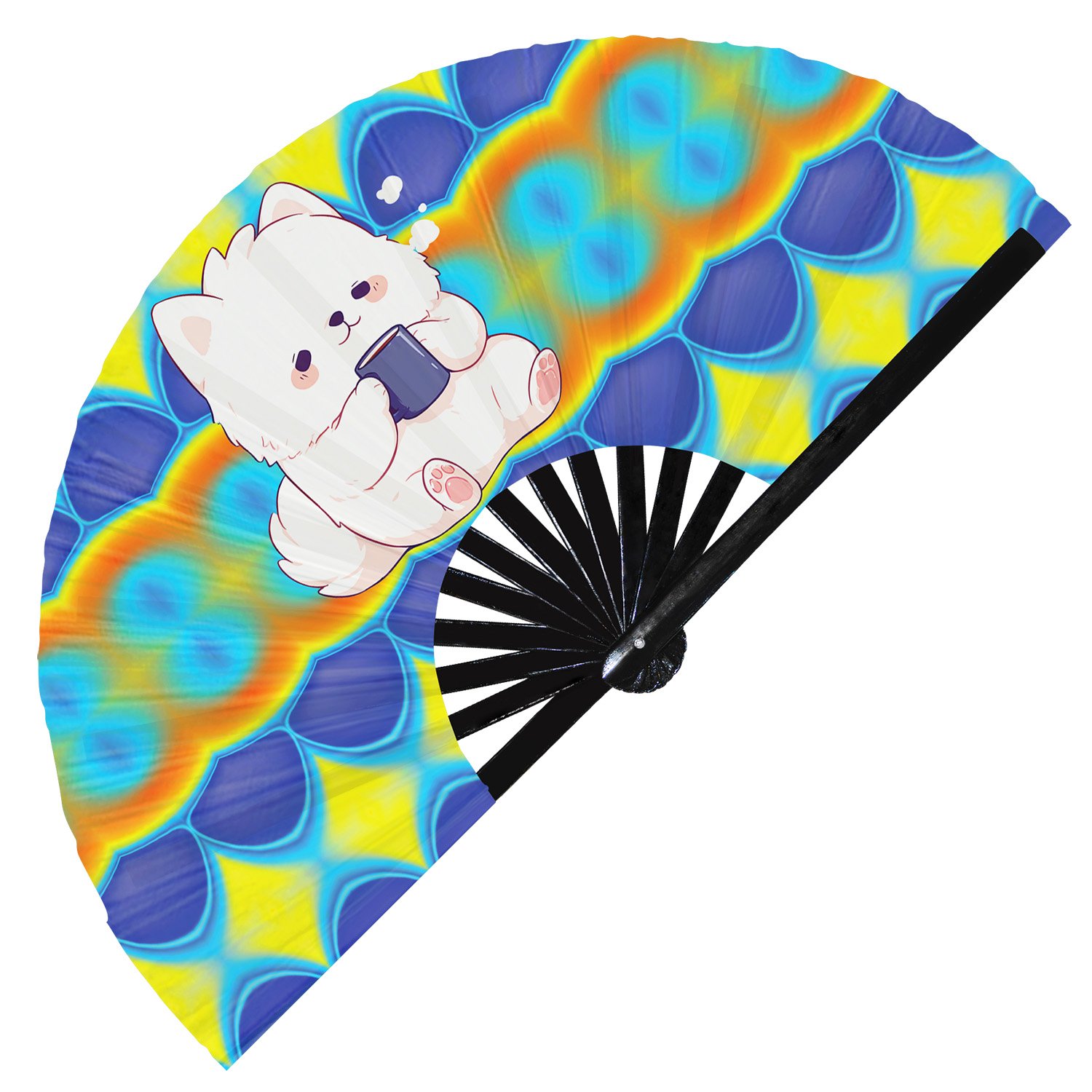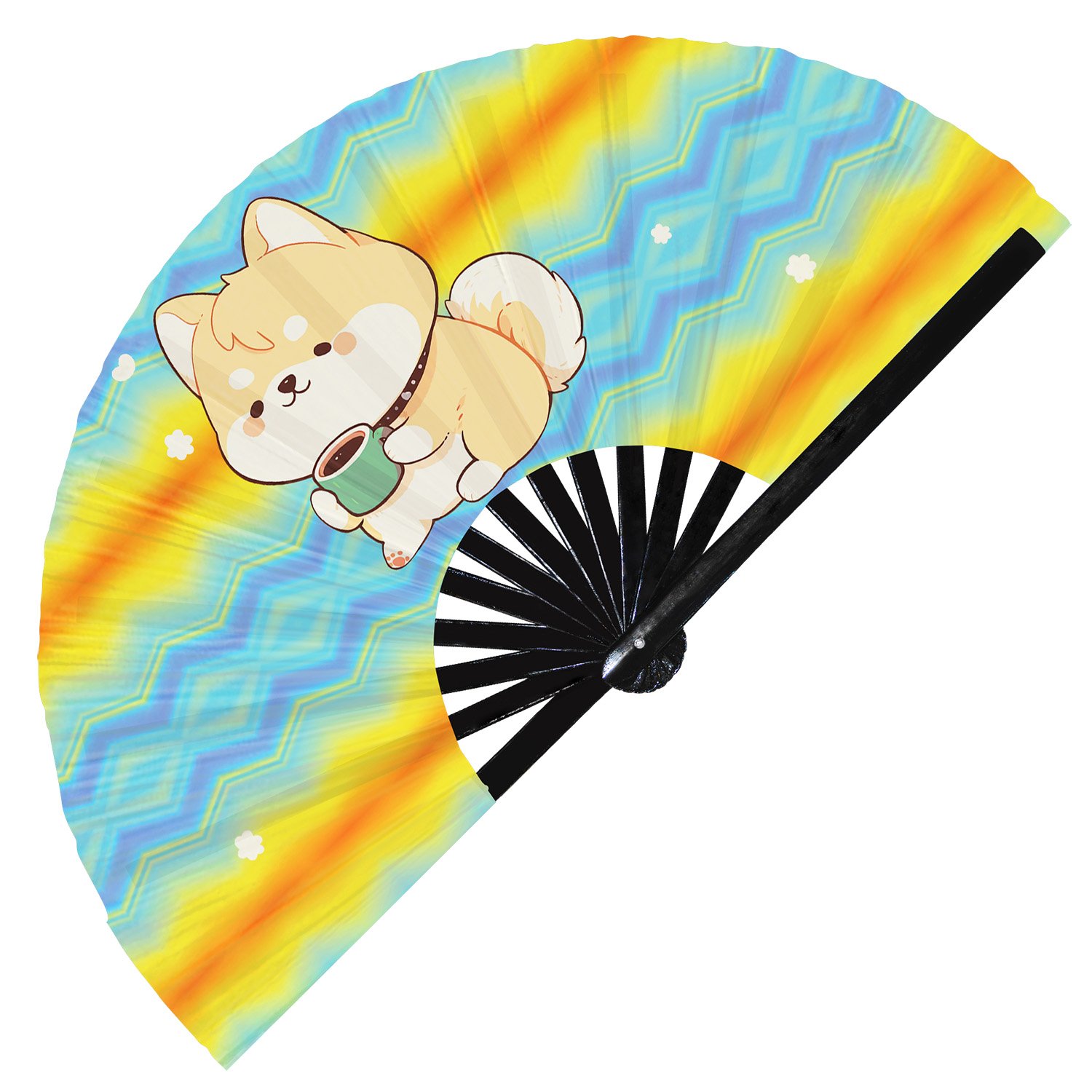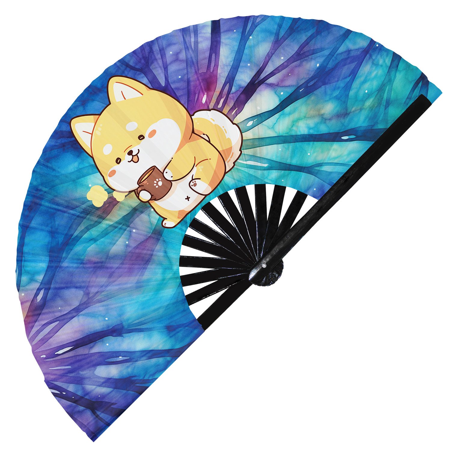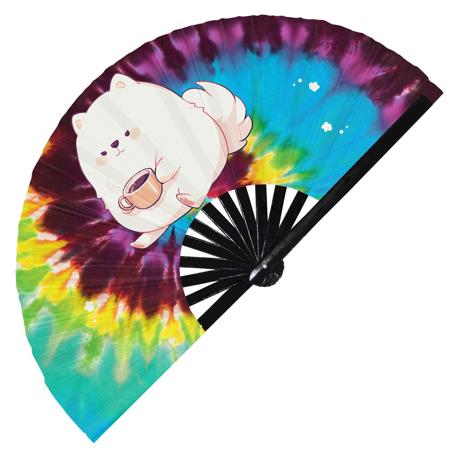 Cute Dog Drinking Coffee Rainbow Puppy – Clack Folding Rave & Festival Hand Fan