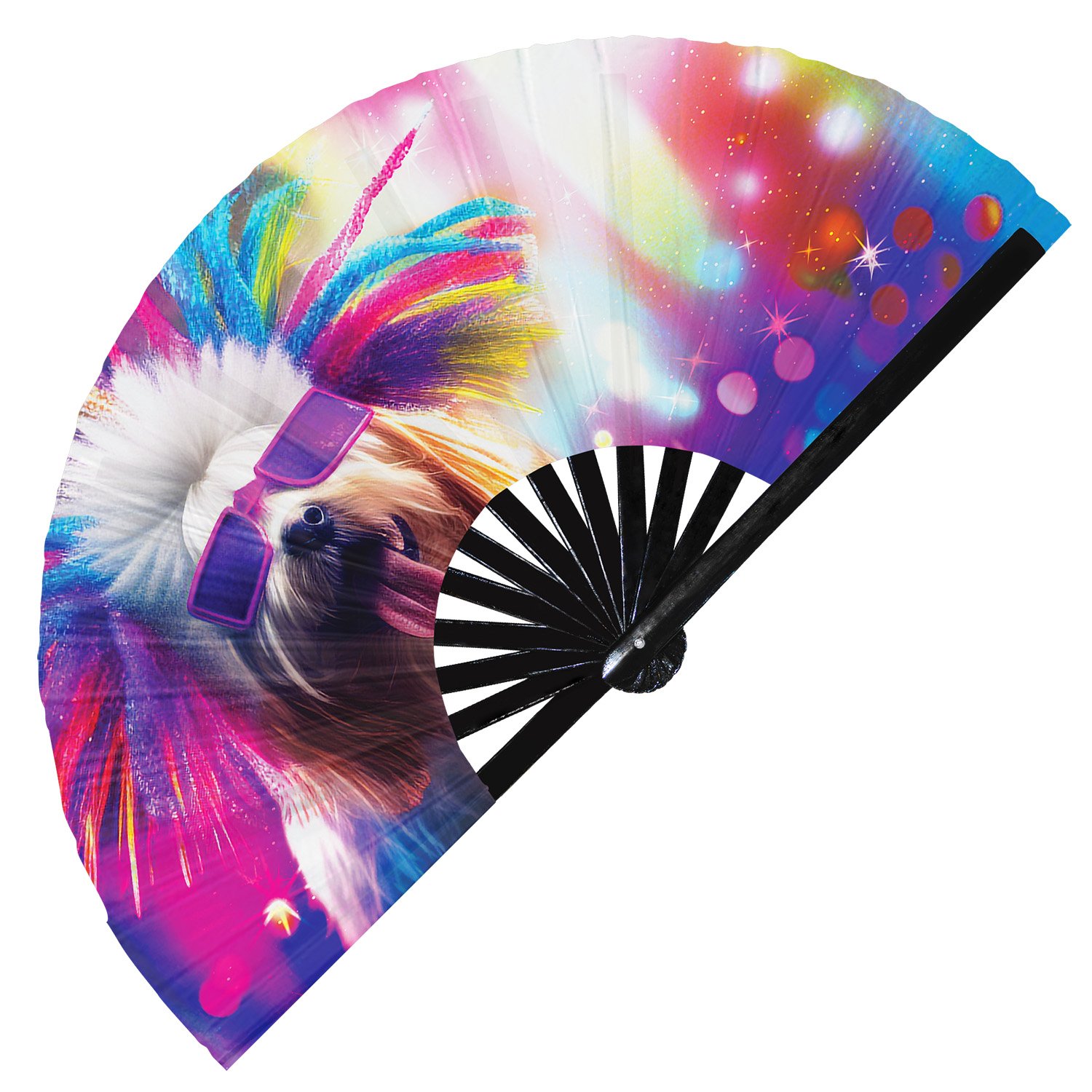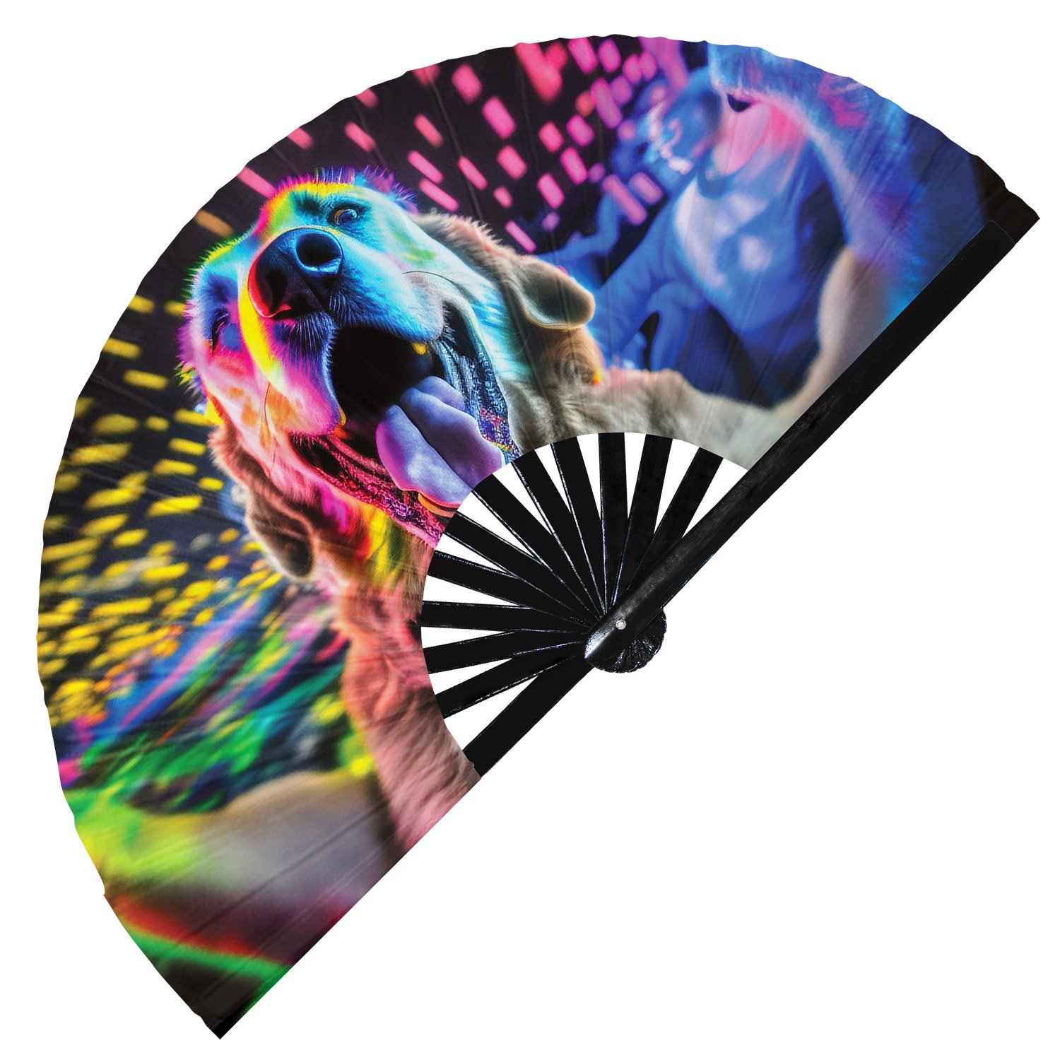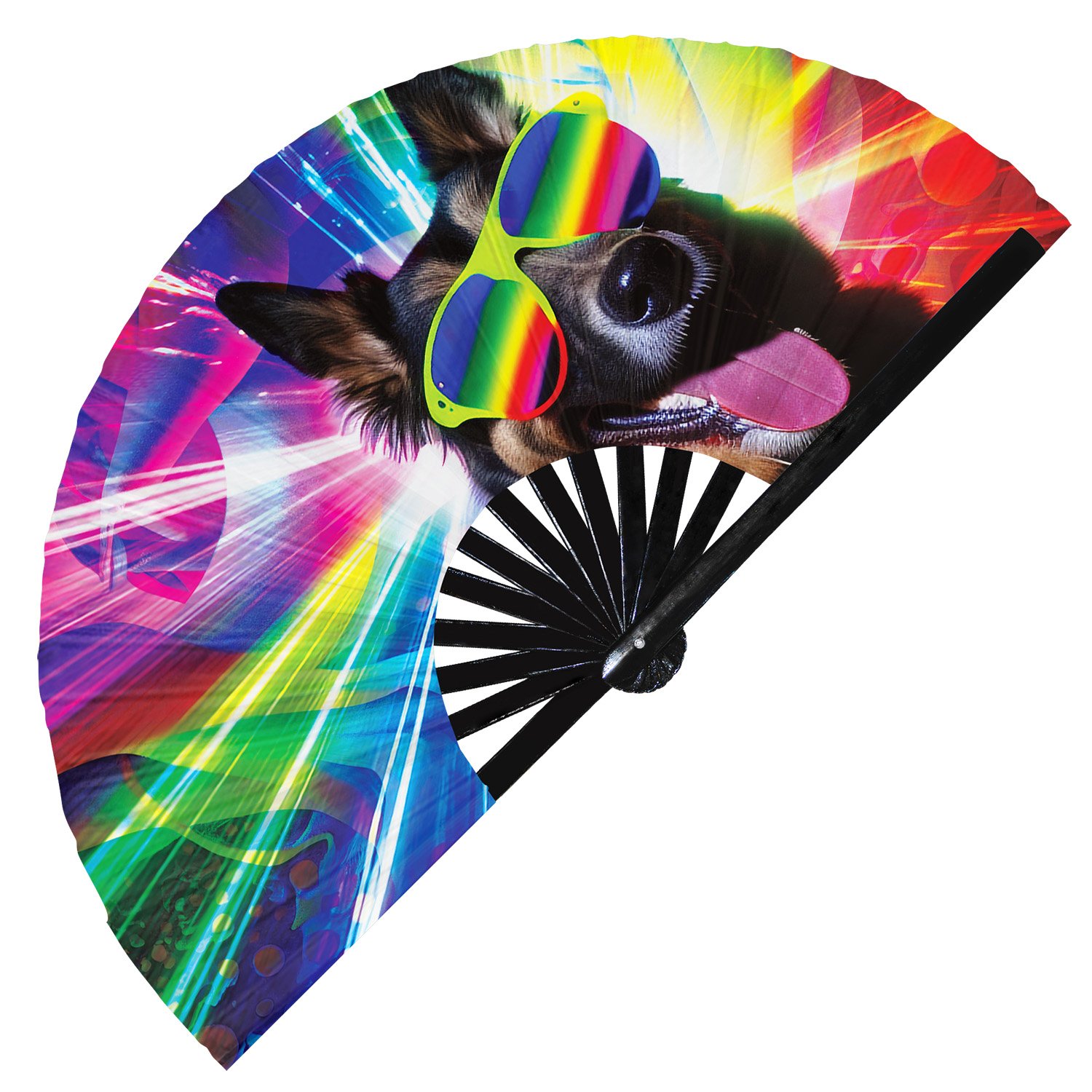 Neon Rave Party Dog Rainbow Dj Puppy Trippy – Clack Folding Rave & Festival Hand Fan