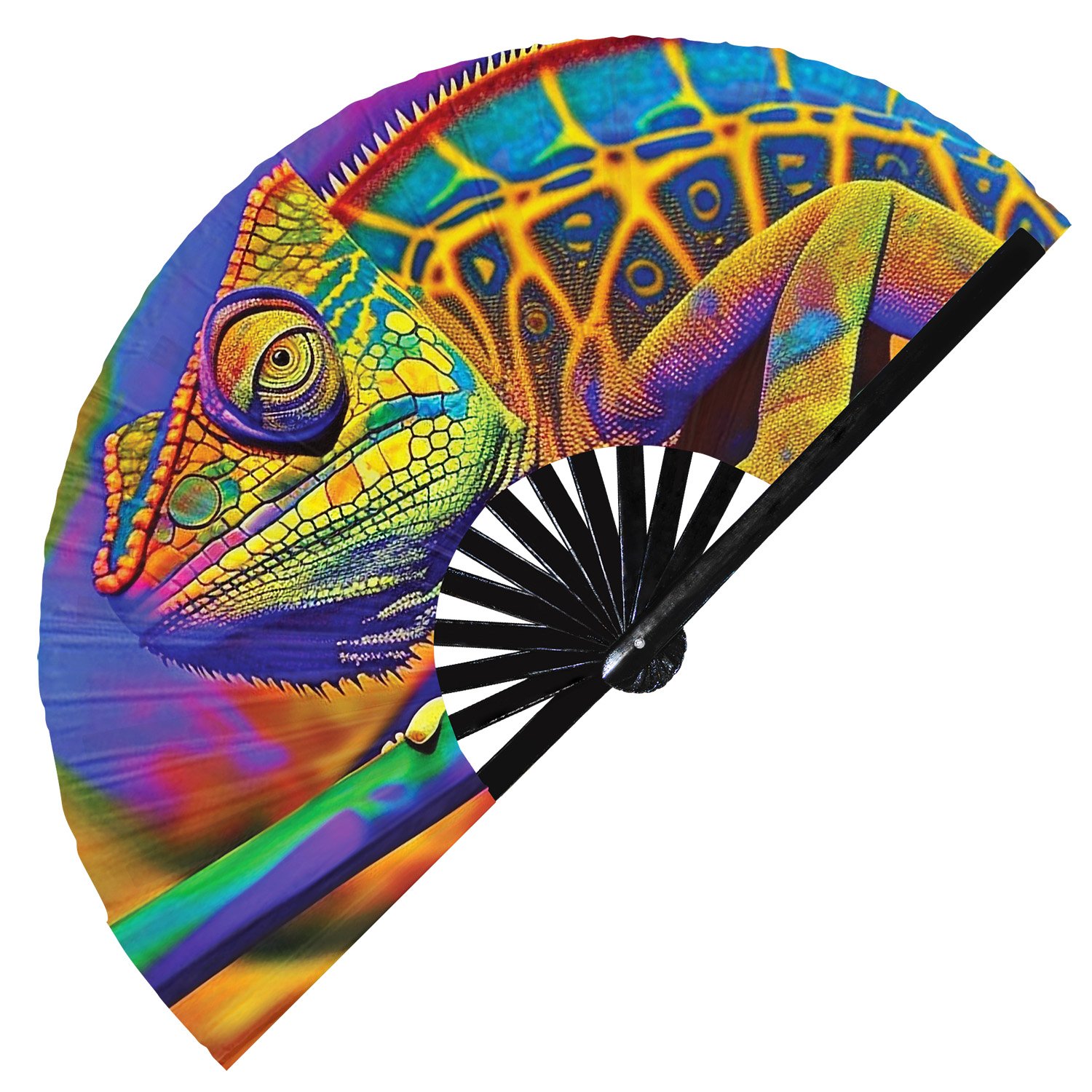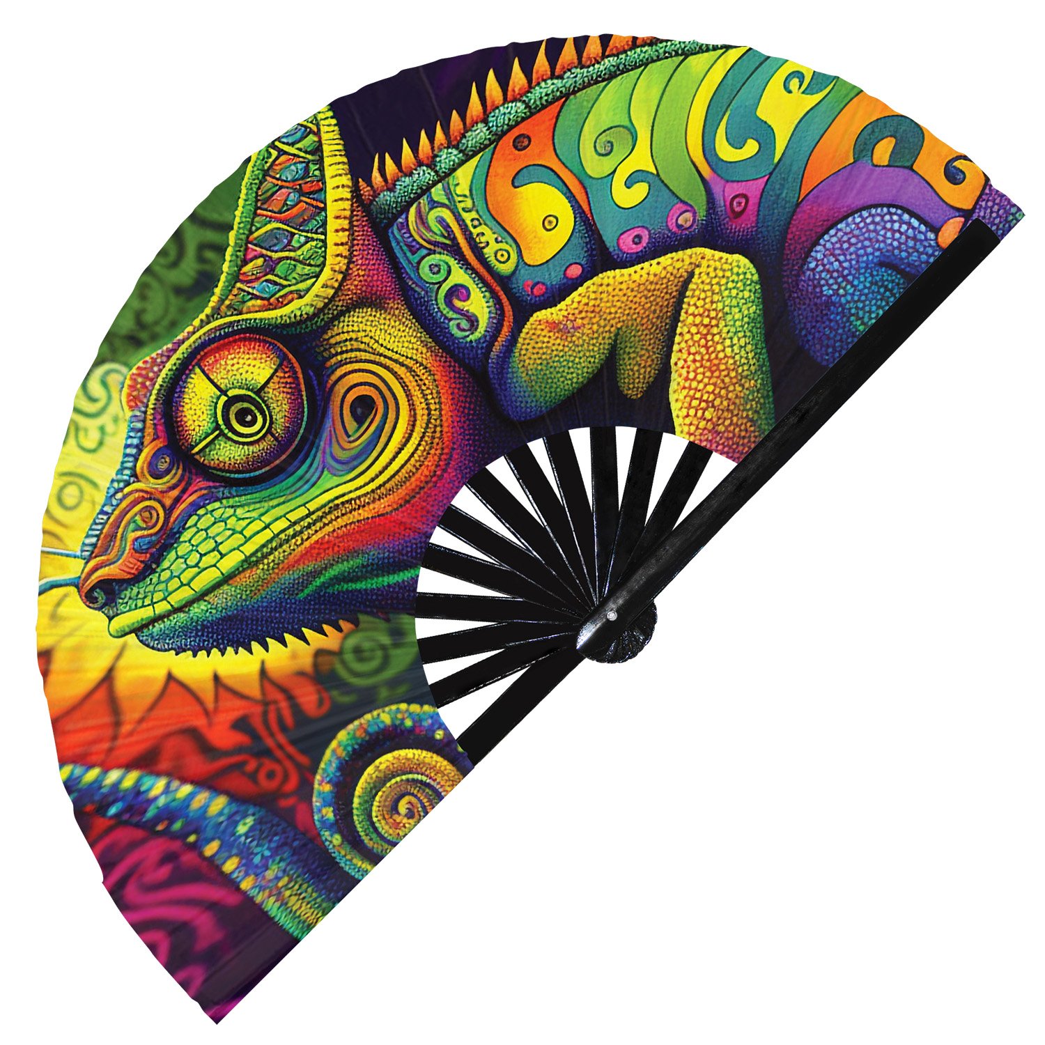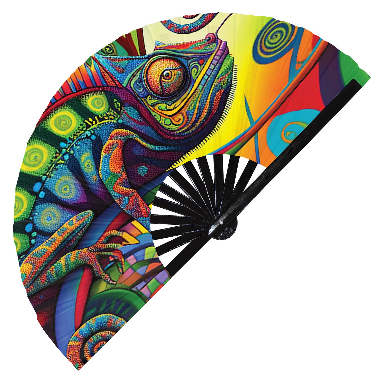 Rainbow Chameleon Trippy Pyschedelic - Clack Folding Rave & Festival Hand Fan